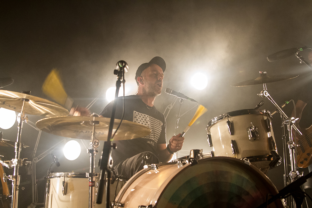 After another round of deafening applause and cheers, the show got underway. Their stage setup was ordered chaos. I counted 8 guitars total, 4 of them solely for lead singer/guitarist Fin Greenall alone. The drummer, Tim Thornton, was right up front next to Fin, which is a setup I wish more bands would employ. Drummers are often the unsung heroes in the background and provide a lot of entertainment. Bassist Guy Whittaker and guitarist Chris Nicholls flanked them. Behind the band was an intricate web of spotlights primed to flash and flicker in time with the music. It was intense, but perfect for Fink’s music. Shouts of “Fin, I love your beard!!”, “Tim, you’re perfect!!”, and the ever present “I LOVE YOU!!” was heard many times throughout the night. I was baffled as to why Fink isn’t more well known with such a great fan base and consistently strong albums and live shows.