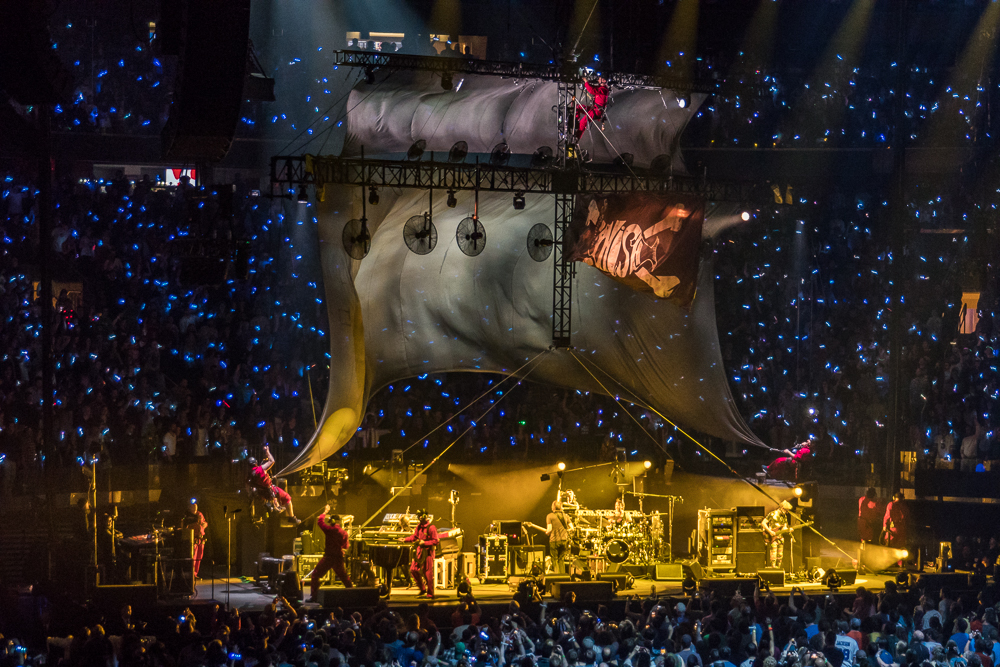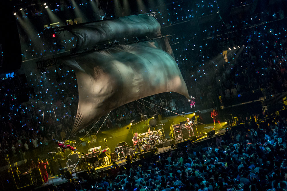 As the song continued, the mast was turned by the riggers to make it look as if the boat was constantly changing course. A roar went down from the sold-out crowd as the Jolly-Roger Phish design was unfurled behind the sails. Then some of the riggers brought two cannons to the stage and loaded them with a cannonball and “shot” out into the crowd and produced explosions of confetti that came from the crowd and ceiling. As the countdown took place and the balloons were dropped the venue lit up for “Auld Lang Syne.” Following the festivities, the band proceeded to play a set of music that all contained ocean or water references.