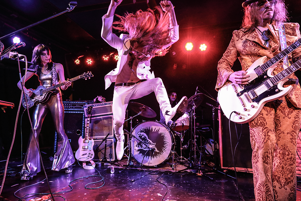 Detangling their fast-moving embellishments, we extracted some juicy facts from the enigmatic glam rockers, who we’d been following and digging hard since their first show last spring. In addition to the full-length debut album they promised to release in 2018, Charlotte noted that they just shot a claymation music video, and are planning to release more 7-inch records, with videos for each song – the next one due out on March 23rd. Plans for each live performance, though, remain up to chance. “I honestly have no idea what we’re going to be doing in this show, so it’ll be interesting to see it unfold,” Charlotte said. “All I’m gonna say is…” David warned, swapping his sex-ed face for that of a stuntman, “…stay close to a fire extinguisher for the safety of everyone in the venue tonight.” “Dude, we have like a million dollars worth of pyrotechnics for this show,” giggled Charlotte, “I hope you have a full hazmat suit.” It was a laughable warning in the cozy confines of The Knitting Factory, but there was a perceptible thread of truth buried somewhere in their banter. “I know we joke around about all this stuff, but I actually do have some experience in pyrotechnics, from the fourth of July this year,” said David, grinning as Charlotte launched into a dramatic retelling. Frontman Nico Fuzz was characteristically quiet, enjoying his bandmates’ descriptions of flames and narrow escapes from explosions. Ironically, later on, during the same nuclear-powered song we first asked them about, Nico was the one shooting fire overhead with a can of hairspray and a lighter.