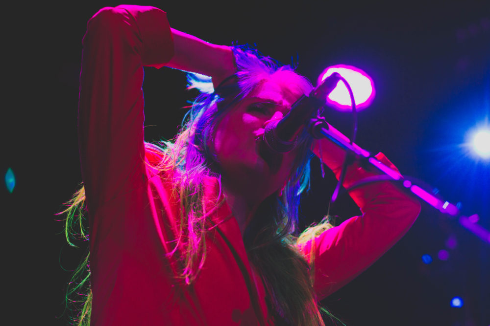 Twenty-year-old front-woman, Chloe Chaidez, is 5 feet of non-stop energy. She tears through the stage with her dance moves like a hurricane barreling through whatever is in its path. From her splits to her handstands to her tumbles and her dramatic knee drops, Chloe kept pulling me in to what really was her show. She even gave me a heart attack as she ran up to the balcony and leapt into the crowd, somehow trusting dozens of strangers to catch her fall.