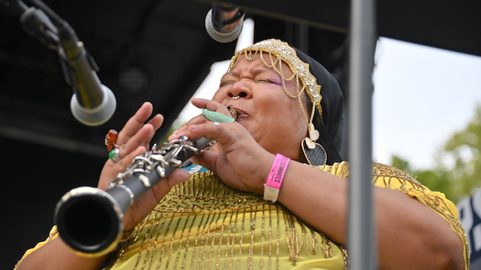 Opening the set was a swinging samba-inspired set by DJ Greg Caz who got the crowd all jazzed up. Then came an explosion of inspiration with the Chicago trio called Sistazz of the Nitty Gritty, who had that appropriately loose and improvised feel with a classic jazz and blues sense that worked well opening for the almighty Arkestra. The group is headed up by clarinetist and vocalist Angel Bat Dawid, who started this formation as a pandemic-inspired side-project from her full seven-piece band called Tha Brotherhood. She is joined by the bountiful talents of pianist and vocalist Anaiet and bassist Brooklynn Skye Scott. Anaiet is a particularly gifted composer, and to hear Angel belt out a tune is nothing short of magical, and together they make a potent team. They did tease of upcoming studio material, so I look forward to hearing more from these three extraordinary talents.
