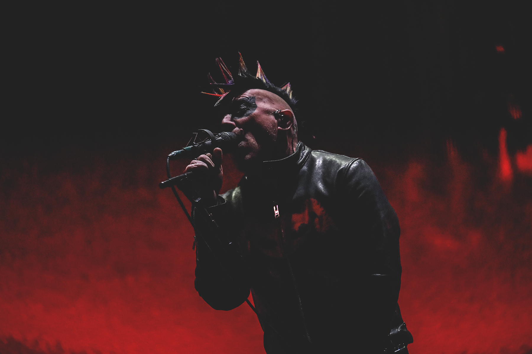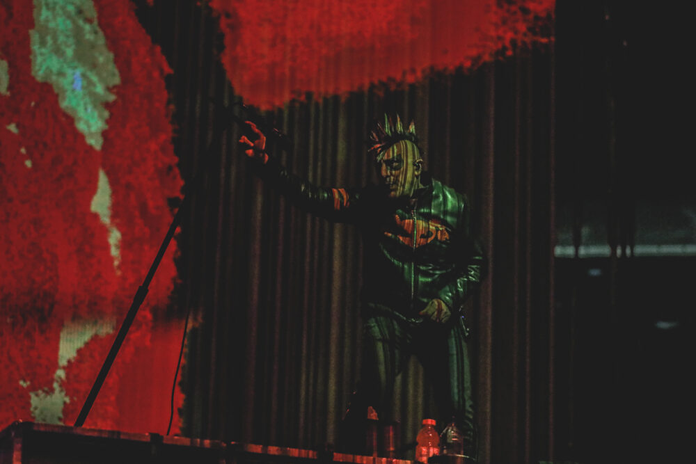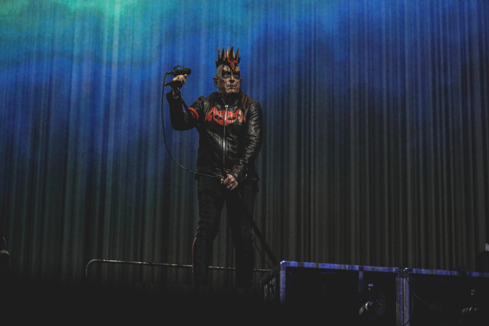 X-ray vision within Pru Center on Saturday would have revealed skulls banging wildly and bones moving well outside of the body’s standard time signature. And the rest of the band would surely forgive those of us watching Danny Carey’s dynamic drumming more than anything else. All of their contributions are crucially badass; it’s not as if he’s outshining the rest or any such imbalance. It’s just that Carey’s style and technique behind the set is so striking, destructive, and suspenseful, it keeps yanking your gaze back up to his platform. In sync to a chilling degree, bassist Justin Chancellor – who was all smiles on Saturday – brought gooey and hard-edged grooves, grabbing many eyes too. It was all a canvas for the elegantly brutal guitar work of Adam Jones, which can sometimes sound more like alien signals or the lower-decibel hums of nature than something created by a musical instrument. And to our immense relief, Maynard James Keenan’s voice has not only sustained its rich qualities through two bouts of Covid, but seemed to reverberate more powerfully than ever. Delivering each incisive line with fervor in his voice, MJK swayed in his familiar intimidating stance. His multicolored spikes and clownish dark makeup looked especially dramatic before the enticing hellscape of flames and skeletal graphics behind them.