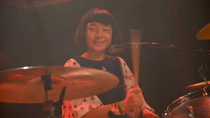 Shellshag came on next, and they’re a veteran NYC guitar/drum rock duo, and lovingly wild couple who trade off lead vocals as they perform facing each other over a large alien-looking device that hold all their instruments. Guitarist John Driver has a deeply baritone presence with a sweet charm, and drummer Jennifer Shagawat is a playfully impish spirit that bounces around with bells on her feet as she plays which makes her whole body a wildly jovial percussive instrument. They play until their set hits a big crescendo, and they take all their equipment and stack it all in a big pyramid in the middle of the stage. Their shows are always great fun and so full of energy, and it’s great to see them out playing live again.