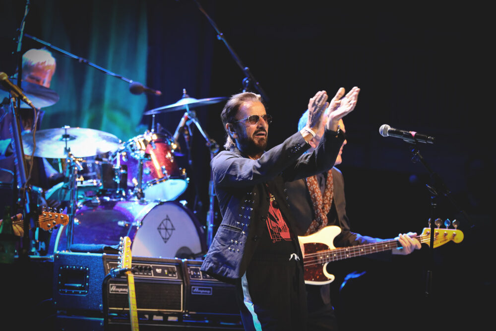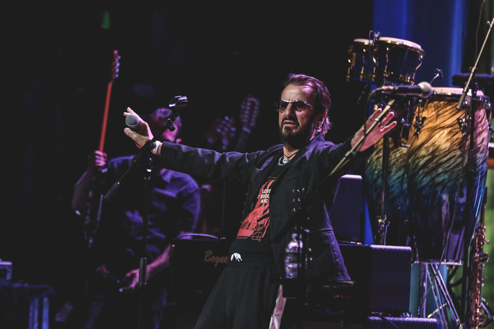 Many attendees had been holding their tickets for this particular show for more than two years, and the star alluded to this in his early greeting. After opening an upbeat cut of Carl Perkins’ “Matchbox,” Ringo said, “Thank you, thank you! Very kind. Very loving. Very peace and loving. I want to thank you all for coming out tonight. It’s a crazy world we live in. Four tours we had to cancel, and now we’re in this one. This is our sixth night I think, so I’m glad to be back! And I’m glad all you guys and girls came out to see us. New Yoooork, baby!” One of Ringo’s finest skills resurfaced frequently: his ability to rapidly sweep the room and connect with everyone, even from behind his tinted shades. It’s utterly insane how Ringo has not visibly aged and continues to rock with so much limitless energy. Those broccoli emojis in his tweets may be a subtle hint for attaining eternal youth, given how fit he looks right now. His Love Rocks NYC tee was tucked into joggers as he raced between his elevated drum set and his frontman duties below, depending on the song.