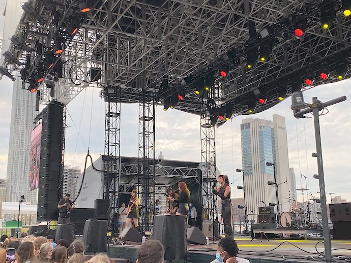 In the early 2000’s Kathleen Hanna caught Lyme Disease and spent over a decade fighting its debilitating effects, but she did eventually begin to play live again with her project Julie Ruin that involved her old Bikini Kill bassist Kathi Wilcox. In 2017, I was blown away by catching the first official Bikini Kill reunion when these two played with their former drummer Tobi Vail at a book event about the seminal all-ladies band Raincoats at The Kitchen in Manhattan. They only played one song, but you could cut the excitement in the room with a buzzsaw. It didn’t take long before they were touring as a unit once again, and I was fortunate enough to catch one of their explosive Brooklyn shows at Kings Theater in 2019. This Pier 17 show was on the rooftop of the Chase Building at the South Street Seaport, set to the glorious backdrop of the Brooklyn Bridge, and the open air setting gave the night an even more festive feeling than seeing them in a smaller, cramped venue.
