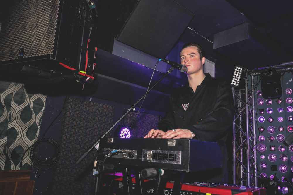 The Warmduscher guys were hanging around their merch table before the show and even treating fans to drinks at the bar, surreally making the experience feel like a spur-of-the-moment party instead of a preplanned ticketed event. And the backyard bash mix that is their discography is right in line with that celebratory atmosphere. Bassist Ben Romans Hopcraft described it well when P&W sat down with the band for an illuminating talk before the show (interview coming soon). “The first early gigs of Warmduscher were just so fucking hectic that we used to try to call it jazz, just to get away with how hectic it was. I usually say ‘party music,’” he laughed, staying true to their roots, since Warmduscher began as an impromptu band for a house party back in 2014. “I just say ‘party music’ now because it kind of sounds like disco a bit, and punk, and a bit of funk, and a bit of pop. To me, it just makes you ultimately want to go out and enjoy yourself.” Much later that night, it was abundantly clear how much Brooklyn’s sweatiest and moshiest were enjoying themselves, fighting for either the closest or the safest spots within the crowded confines. Being the second to last show in Warmduscher’s U.S. run, one got the vibe that they had, at some point backstage perhaps, collectively agreed upon making it a wild night.